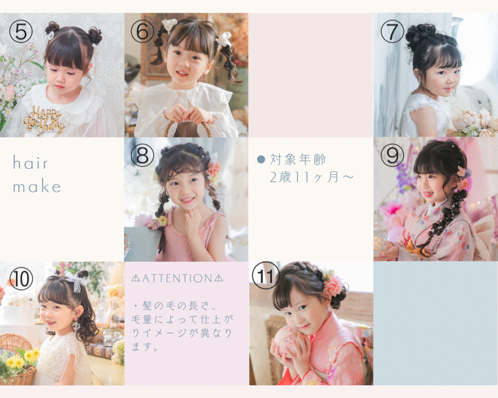 *上記プランのヘアアレンジは地毛アレンジ7種類、ウィッグアレンジ4種類の合計11種類の中から1つお選びとなります*